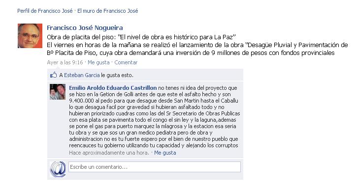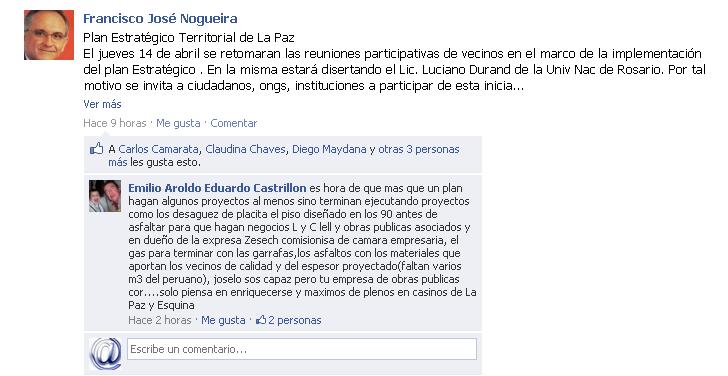 Ante comentarios que se adjudican al integrante del Superior Tribunal de Justicia (STJ) de Entre Ríos, Emilio Castrillón en la red social Facebook, sobre posibles irregularidades en obras públicas de La Paz, el intendente José Nogueira solicitará «la intervención de la Fiscalía de Estado de la provincia de Entre Ríos y del Juzgado de Instrucción local a los fines de que tomen las medidas que consideren convenientes».