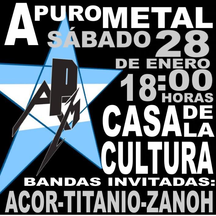 Este sábado 28 de febrero se realiza en La Paz la 1º edición del Festival de Rock «A Puro Metal». La entrada es libre y gratuita. Las bandas que tocarán en el patio de Casa de la Cultura son: Zanoh (La Paz), Acor (Santa Fe) y Titanio (Diamante).