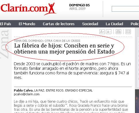 Se trata del titular «La fábrica de hijos: conciben en serie y obtienen una mejor pensión del Estado», de un informe escrito por el periodista Pablo Calvo en relación con la pensión que reciben del Estado las madres de familias de escasos recursos que tienen siete hijos o más.