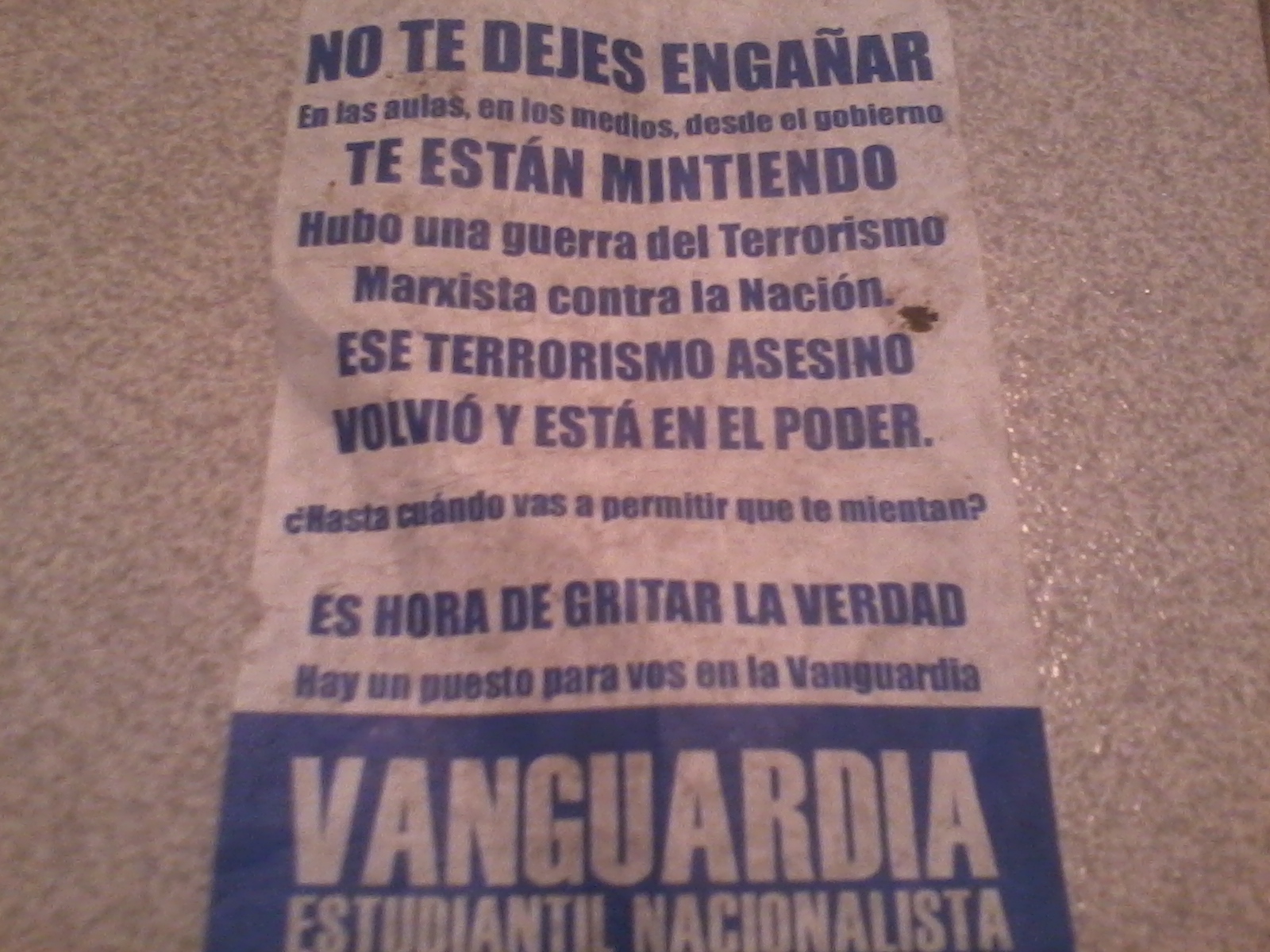 En las escaleras de la escuela Normal, frente al colegio el Huerto y a la Universidades de Ciencias Económicas y Católica Argentina, aparecieron panfletos blancos con texto en azul donde se reclutan con un lenguaje militar a jóvenes para ocupar “puestos” en el conjunto numeroso de guerra reunido para ciertas operaciones táctica denominado “escuadra” de a VEN, según confirmó agencia AIM.