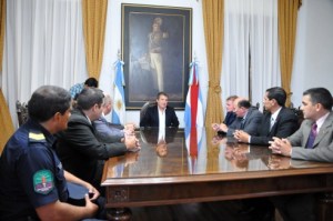 Acompañado por el ministro de Gobierno, Adán Bahl, el mandatario recibió en el Salón de Acuerdos al director de Operaciones y Seguridad, Sergio Rufiner; al titular de la Departamental Paraná , Ricardo Frank; al jefe y al subjefe de la División Custodia Gubernamental , Noel Spretz y José Arismendi, y al subjefe de guardia, Oscar Castro, que llegaron junto al jefe de la Policía de Entre Ríos, Héctor Massuh.