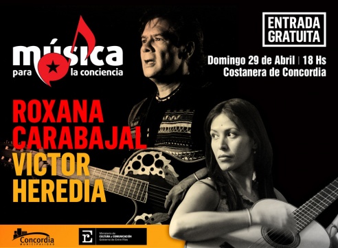 El cantautor Víctor Heredia y la folclorista Roxana Carabajal se presentarán con entrada libre en la costanera de la ciudad de Concordia el domingo 29 de abril. Será en la tercera edición de Música para la conciencia, ciclo de shows gratuitos que organiza el Gobierno de Entre Ríos. Se conmemorará el Día Internacional de los Trabajadores.