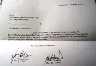 La edil concordiense del Frente para la Victoria Claudia Sanabria exhibió una nota en la que consta su renuncia al Plan Argentina Trabaja, con fecha del 3 de diciembre de 2011, y que lleva su firma y la del presidente de la cooperativa de trabajo “Puerto de Paz”; Juan Carlos Pathenay.