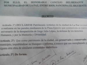 Artículo. 1º) DECLÁRESE Patrimonio Artístico de la ciudad de La Paz los murales a realizarse en las paredes medianeras de la Plaza Ejercito que conmemora un nuevo aniversario de la desaparición de Jorge Julio López, la defensa de los derechos Humanos, y por la Memoria y Diversidad.