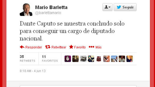 “Dante Caputo se muestra conchudo solo para conseguir un cargo de diputado nacional”, escribió Barletta en su cuenta oficial de Twitter. Según confirmó a Clarín el propio Barletta, el mensaje no se trata de un error, ni es obra de un hacker o algo parecido. “Sí, yo escribí que Caputo actúa como un conchudo”, explicó a este medio.