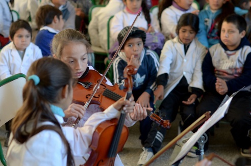 Poco a poco los pequeños músicos el orquesta infantil Eva Perón desenfundaron los instrumentos y fueron ubicándose para hacer sonar los primeros compases en el salón de la escuela Nº 208 Intendente Juan Carlos Esparza, ubicada en el barrio Mosconi de Paraná. La orquesta cuenta apenas con ocho meses de vida e hizo su primera presentación formal este año en el acto de conmemoración del 25 de mayo en el escenario de su propia escuela. Ante miradas expectantes de pequeños en guardapolvos blancos y de colores de jardín, se concentraron en sus partituras y el afinado de cada instrumento. Las pequeñas sillas del auditorio se fueron llenando con niños y niñas entre curiosos y sorprendidos esperando ansiosos el inicio del concierto.