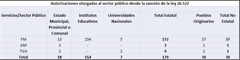 Entre las autorizaciones al «sector público», desde el organismo detallaron que se otorgaron 18 señales a municipios y/o provincias, 154 a institutos educativos, 7 a universidades nacionales y 39 a pueblos originarios. La información fue enviada a la Corte Suprema para que la sume a la causa que lleva adelante el Grupo Clarín en relación a la inconstitucionalidad de cuatro artículos de la ley de Medios.