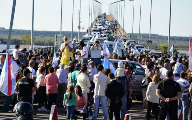 Los asambleístas de Gualeguaychú se retiraron del Puente que conecta Entre Ríos con Fray Bentos tras decidir no ingresar a Uruguay luego de que las autoridades impidieran el paso a los miles de asambleístas que, junto al intendente de Gualeguaychú, Juan José Bahillo, tenían previsto entregar un petitorio en contra del aumento de producción de la pastera UPM.