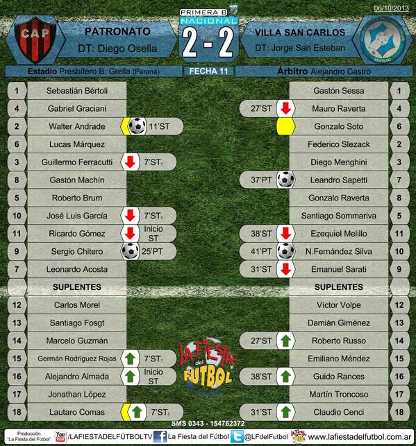 Final en Paraná. Patronato 2 (Chitero y Andrade), Villa San Carlos 2 (Sapetti y Fernandez Silva). Con este resultado Patronato llega a los 13 puntos en la B Nacional. La próxima semana jugará ante Sarmiento de Junín. (La Nota digital)