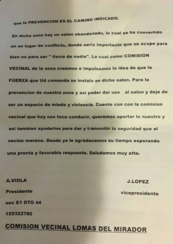 El escrito elaborado por la comisión vecinal fue presentado hace unos días e invita a la fuerza nacional a instalarse y patrullar la conflictiva zona de Paraná.