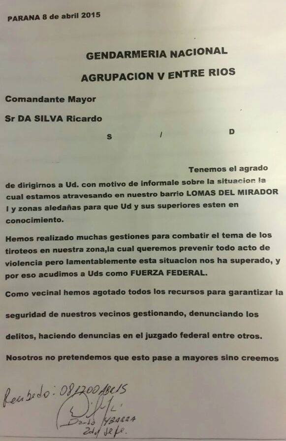 Vecinos del Barrio Lomas del Mirador de Paraná, tomaron la decisión de presentar una nota ante Gendarmería para que refuerce la seguridad en ese sector de la ciudad a los fines de terminar con la violencia.