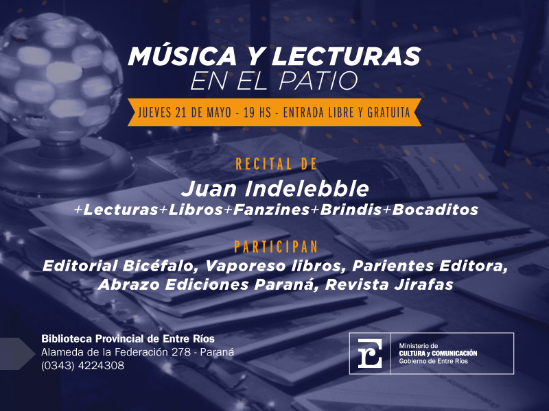 El Ministerio de Cultura y Comunicación invita al recital de «Juan Indelebble», en el patio de la Biblioteca Provincial. Habrá exposición de libros, revistas, lecturas. La cita es este jueves a las 19.