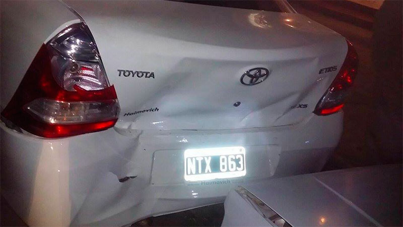 El Volkswagen Gol Dominio AMP 699 que circulaba por calle Hipólito Irigoyen embistió desde atrás a un automóvil color blanco marca Toyota Etios dominio NTX 863 que estaba estacionado contra el cordón derecho de la misma calle, mientras sus dueños realizaban compras en el comercio mencionado.