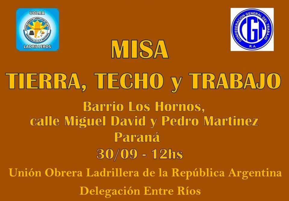 Este miércoles 30 de septiembre, el Sindicato de Ladrilleros invita a una Misa por Tierra, Techo y Trabajo en el barrio «Los Hornos» de la capital entrerriana. Intentan frenar el desalojo de casi 50 familias.