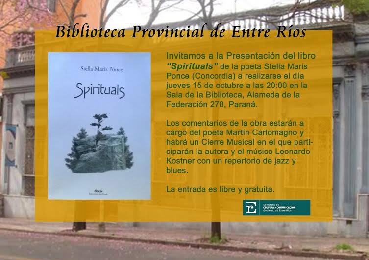 Stella Maris Ponce (Concordia) presenta este jueves 15 de octubre el libro SPIRITUALS en la Biblioteca Provincial de Entre Ríos.