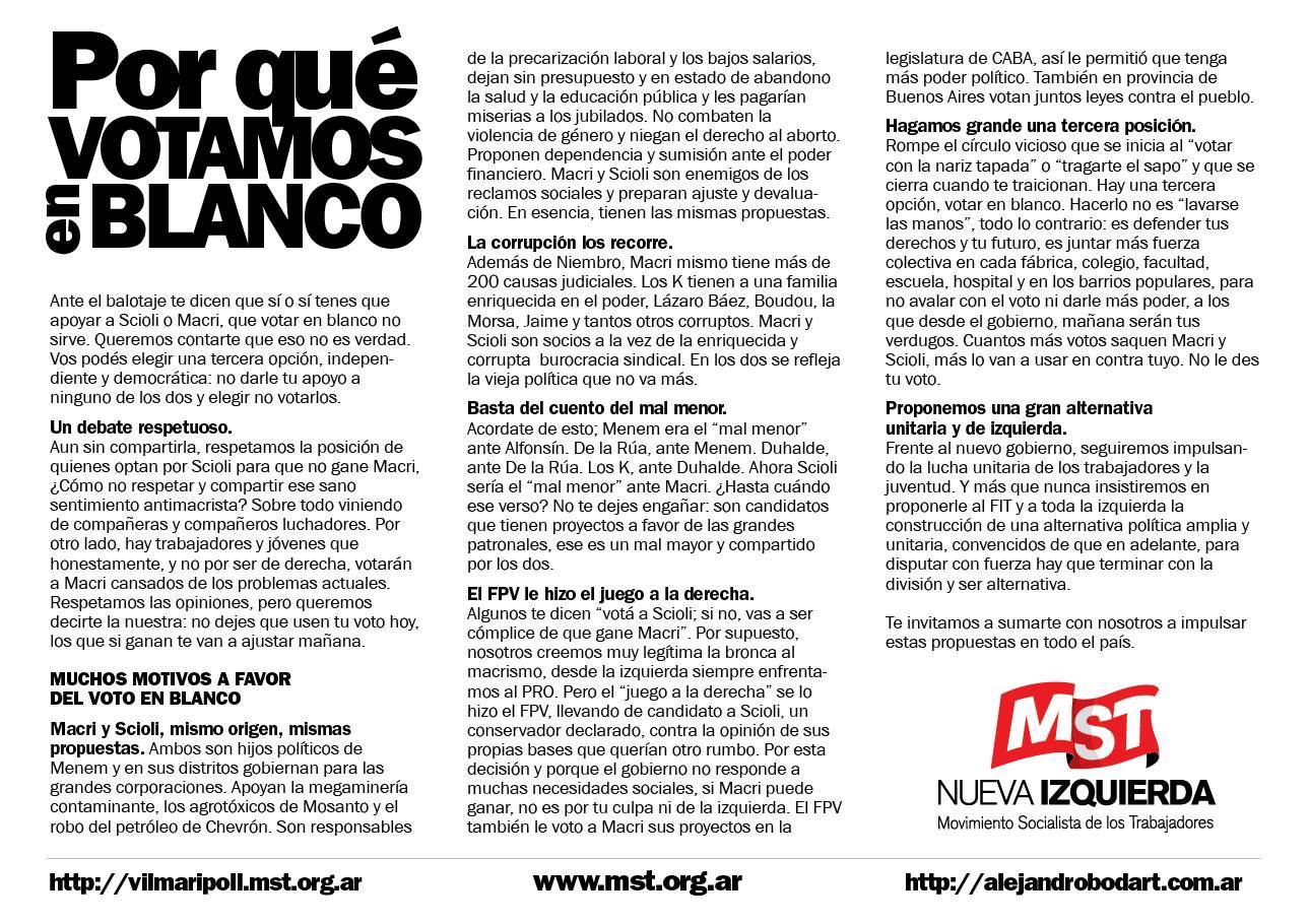 En un documento titulado “Nuestra posición frente al Balotaje: Contra los candidatos del ajuste, convocamos a una campaña unitaria por el voto en blanco”, el MST-Nueva Izquierda de Entre Ríos convocó a “todas las organizaciones, dirigentes, referente políticos, sociales, sindicales e intelectuales de izquierda” a coordinar una campaña para impulsar el voto en blanco.
