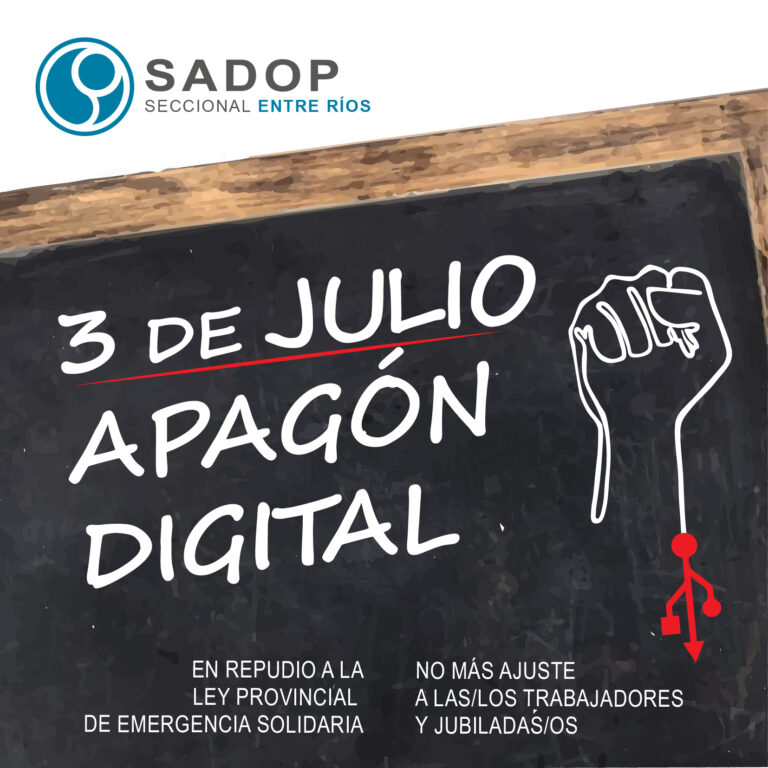 Por tal motivo, en el uso de sus facultades, el Consejo Directivo de SADOP Seccional Entre Ríos resolvió un apagón digital para el día viernes 3 de julio como medida de acción directa en repudio a dicha norma, la cual afecta a las y los aportantes al régimen previsional de nuestra provincia.