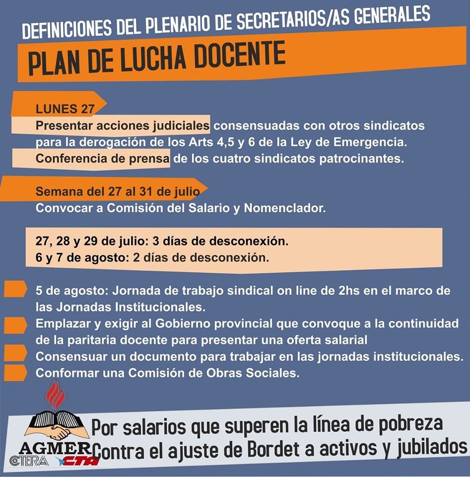 Transcribimos el Plan de Acción del sindicato docente AGMER. Entre otras medidas, contempla 5 días de huelga (desconexión «efectiva» de internet) y acciones judiciales.