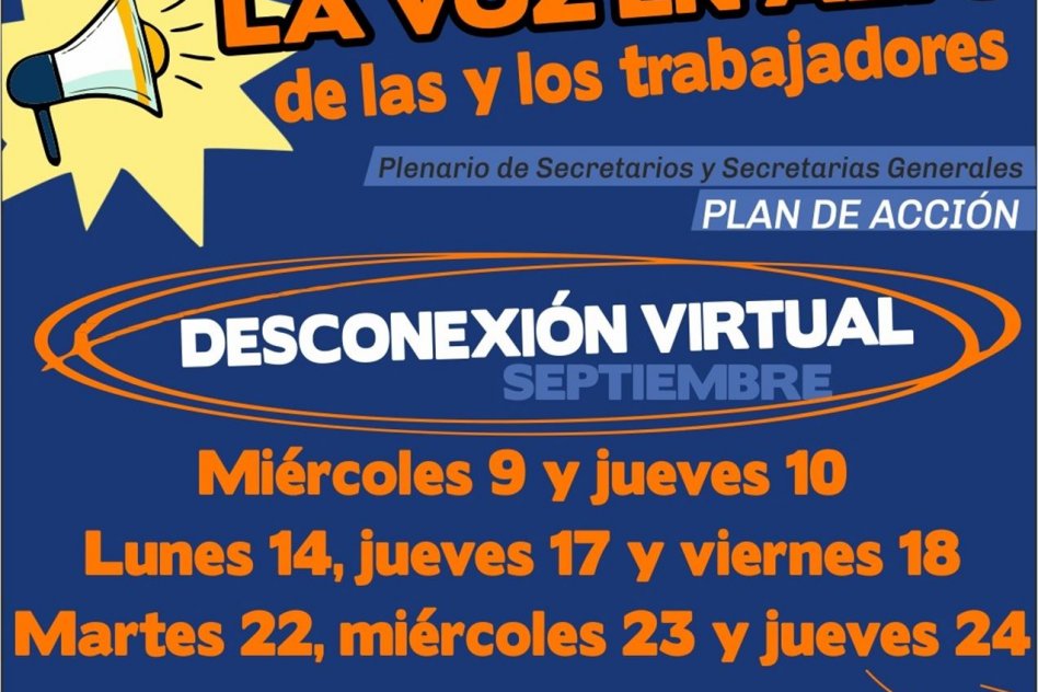 El plan de acción del gremio -establecido por plenario de secretari@s generales- también fijó para el mes de septiembre paros virtuales: lunes 14, jueves 17, viernes 18, y continúa martes 22, miércoles 23 y jueves 24.