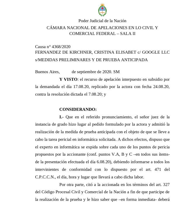 “De este modo, Cristina Kirchner tendrá el pedido de prueba anticipada y podrá entrar a los servidores de Google para garantizar que no se altere ninguna información que se haya elaborado con el único fin de dañarla”.
