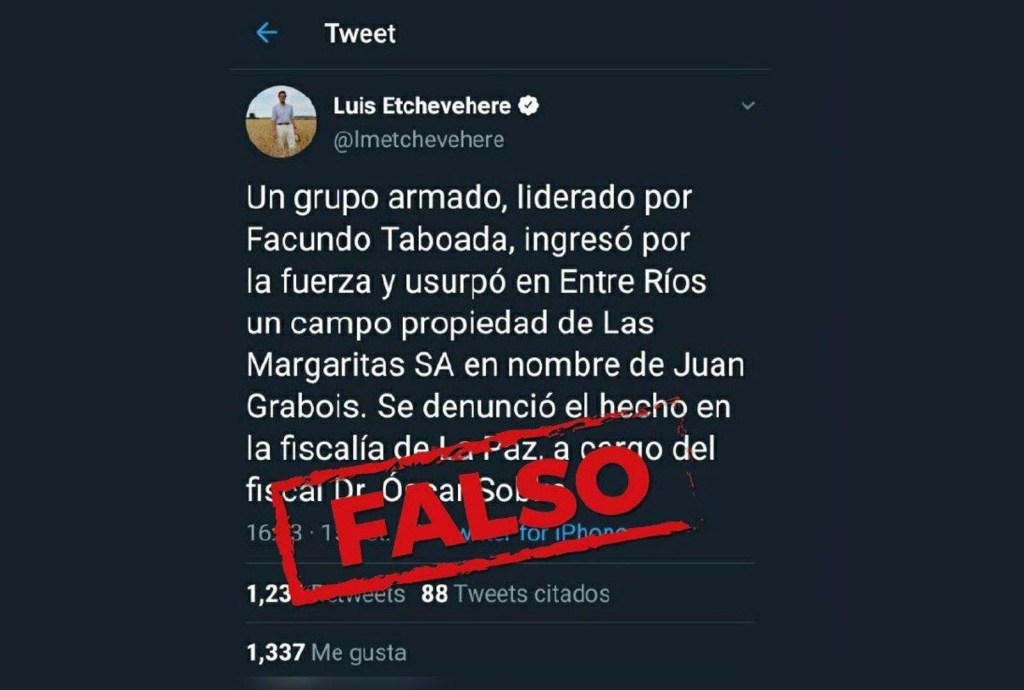 Luis Miguel Etchevehere hizo una denuncia por usurpación y amenazas, tuiteó que “un grupo armado” “ingresó por la fuerza y usurpó”. Pero «como la mentira tiene patas cortas» –señalaron desde el Proyecto Artigas– el fiscal Oscar Sobko lo negó y aseguró que el ingreso «no fue violento».