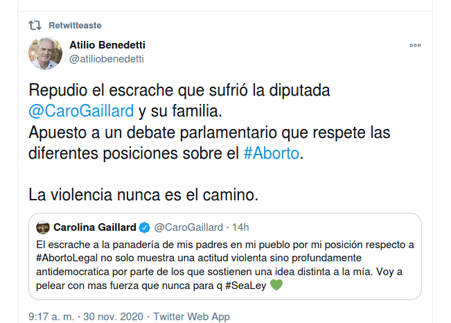 En tanto, Atilio Benedetti señaló en su perfil público: «Repudio el escrache que sufrió la diputada @CaroGaillard y su familia. Apuesto a un debate parlamentario que respete las diferentes posiciones sobre el #Aborto.