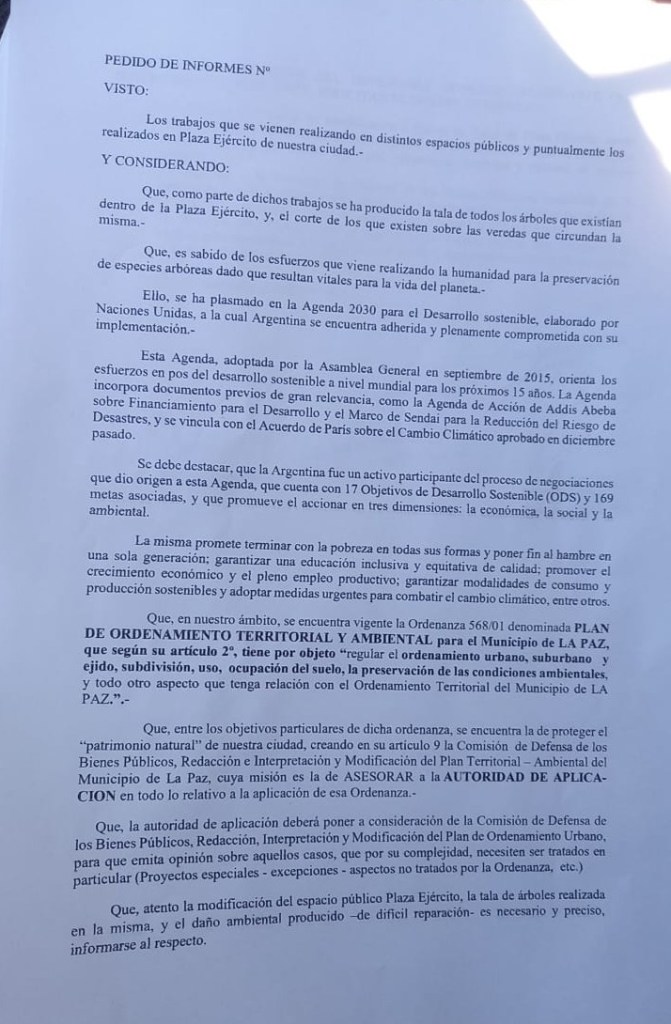 Que, atento la modificación del espacio público Plaza Ejército, la tala de árboles realizada en la misma, y el daño ambiental producido –de difícil reparación- es necesario y preciso, informarse al respecto.»