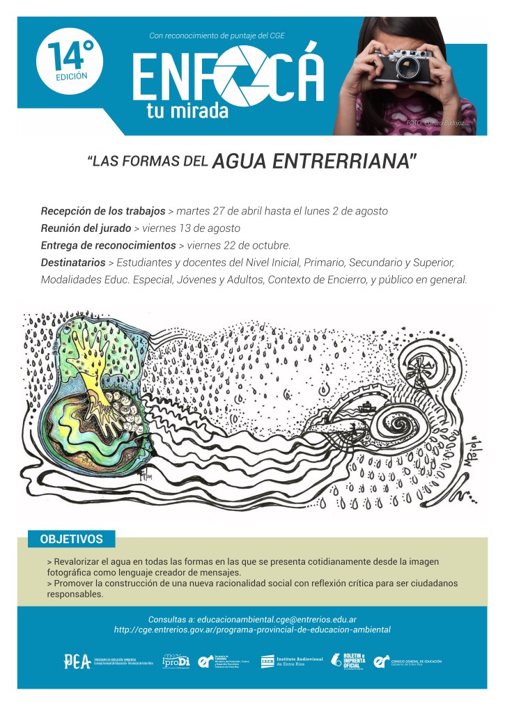 Inició la 14° Edición del Concurso de Fotografía Ambiental “Enfocá tu Mirada”. Este año la temática se centra en “Las formas del agua entrerriana”, la convocatoria busca que estudiantes y docentes, así como público en general, puedan plasmar en una imagen las diferentes representaciones del agua que encontramos cotidianamente, ya sea en nuestros hogares, en las interacciones sociales o en la naturaleza, ríos, arroyos, rocío, lluvia, entre otros. El agua no es sólo fuente de vida, sino también de historia, cultura, paisaje, nos comunica, nos recrea, nos alimenta. En este sentido el objetivo es construir un proceso educativo que posibilite el conocimiento de la importancia del agua, en todas las expresiones de la vida, desde la creación de un mensaje a través de una imagen fotográfica que contribuya a su cuidado y valoración.