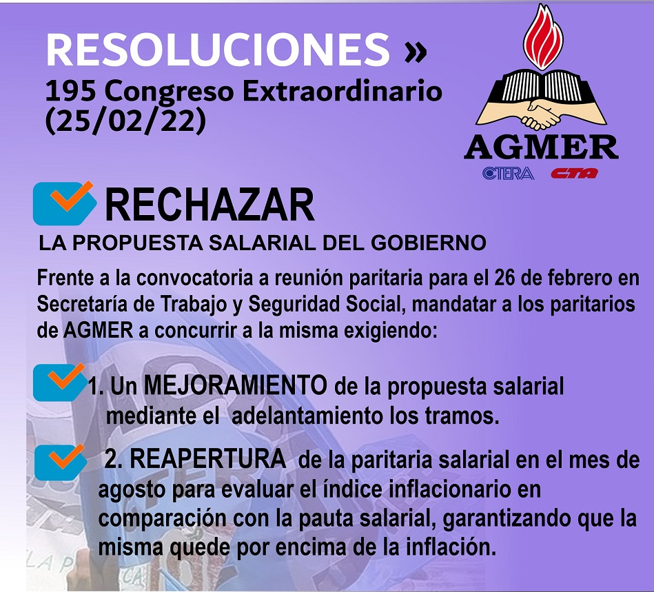 Reunido en Colón, el 195° Congreso del sindicato docente AGMER definió este viernes finalmente rechazar la propuesta de aumento salarial elevada por el Gobierno provincial que consistía un incremento sobre el mínimo en un 21,21% en marzo, un 8,08% en junio, un 8,08% en agosto, y un 8,08% en septiembre con una reapertura de la paritaria en dicho mes.