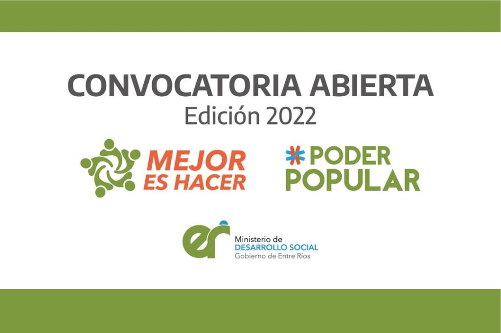 Hasta el 18 de abril está abierta la convocatoria para presentar proyectos en los programas Mejor es Hacer y Poder Popular del Ministerio de Desarrollo Social de la provincia de Entre Ríos.