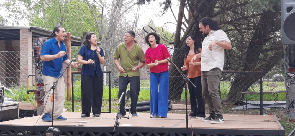 En este formato no hemos salido físicamente de la zona de Santa Fe pero sí hemos participado virtualmente de presentaciones en festivales de Brasil y Alemania. Es un momento difícil para la cultura autogestionada y nos llena de emoción saber que nos están abriendo las puertas en Cabayú Cuatiá porque si bien la virtualidad nos conectó con otras personas, la realidad es que disfrutamos mucho más de la escucha de cuerpo presente compartiendo el mismo espacio. En este momento, el grupo que van a escuchar el sábado está conformado por: Rolando Lukacs, Maria Florencia Grimoldi, Juan Manuel Perino, Dianela Fernadez, Maximiliano Maglianese y Rocio Elizalde; pero nos parece importante contarles que somos parte de un movimiento más amplio que está creciendo. A finales del 2021 se generó un grupo en Nogoyá que actualmente cuenta con nueve integrantes y otro en Chile con seis personas e iniciando este año se impulsó otro grupo en San Martín de los Andes. Todos estos grupos se armaron por gente que tomó los talleres, vieron lo que hacíamos y quisieron que las acompañemos en el armado de grupos para poder replicar la propuesta en sus ciudades. Eso nos da mucha alegría porque es una expansión orgánica. En cada paisaje resuenan diferentes repertorios y es muy nutritivo incluir diversos decires en esta construcción. Aunque haya distancia, podemos compartir y acompañarnos mientras soñamos con concretar un encuentro en donde podamos vivenciar conjuntamente todas las propuestas vinculadas a la música corporal desde esta cosmovisión.