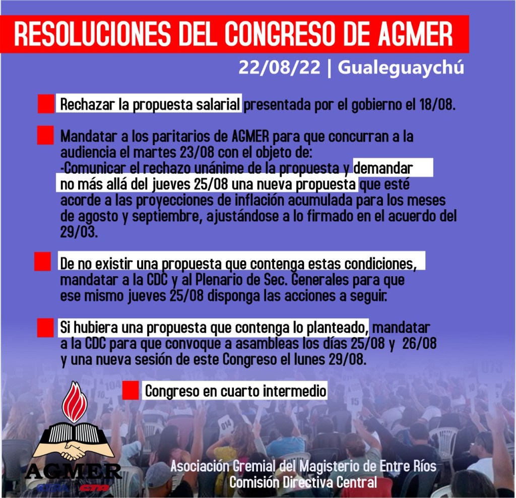 En el Congreso realizado en la ciudad de Gualeguaychú, la Asociación Gremial del Magisterio de Entre Ríos (Agmer) decidió por mayoría solicitarle al gobierno provincial que presente una nueva oferta salarial acorde a las proyecciones de inflación «acumulada para agosto y septiembre». Según la votación, también se ratificó el rechazo al ofrecimiento salarial presentada por el Ejecutivo en la reapertura de la mesa salarial del 18 de agosto.