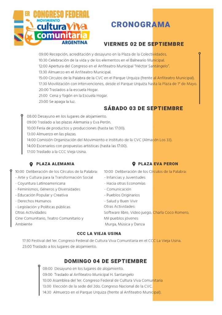Con ese propósito del 2 al 4 de setiembre, múltiples expresiones de la cultura comunitaria confluirán en Paraná a través de delegaciones del país y el extranjero que llegarán para participar en la iniciativa que por primera vez se organiza con carácter federal, y se decidió en noviembre en una asamblea en Villa Devoto (Buenos Aires).