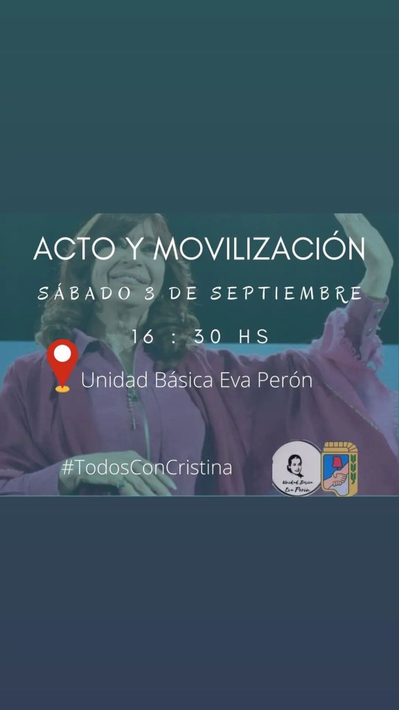 «La Unidad Basica La Paz, convoca a Compañeros, Compañeras, adherentes, simpatizantes, militantes de Movimientos Sociales y demás Partidos que integran el Frente de Todos, para el día sábado 3 de septiembre de 2022, a las 16.30 hs. a un acto y movilización en su casa partidaria, EN DEFENSA DE LA VIGENCIA DE UNA VERDADERA DEMOCRACIA Y DE LOS DERECHOS CONQUISTADOS, DENUNCIANDO Y RECHAZANDO LAS PERSECUCIONES POR PARTE DE LA CORPORACION POLITICA, MEDIATICA Y JUDICIAL, PARA CON NUESTRA COMPAÑERA VICEPRESIDENTA DE LA NACION CRISTINA FERNANDEZ DE KIRCHNER CON CLARAS INTENCIONES DE ATACAR Y PROSCRIBIR DIRIGENTES DE NUESTRO MOVIMIENTO NACIONAL Y POPULAR.»