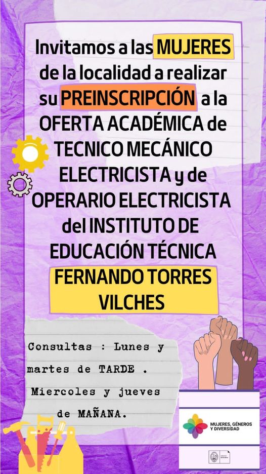 Ya hubo reuniones en la Escuela y también en la Municipalidad de Santa Elena, con el Intendente Daniel Rossi, el rector de la escuela técnica Torres Vilches, prof. Leonardo Weinsettel, la asesora pedagógica Agustina Fernández, la representante de la Asociación feminista «Mujeres Tenían que Ser», en relación al Expediente Nª2.653.440, el cual surge de un pedido por nota presentada en el mes de abril al Director de Educación Técnico Profesional, Profesor Omar Peltzer quien gestionó dicho pedido, es decir, «la inclusión de las mujeres» en este Instituto de Educación Técnica Fernando Torres Vilches.