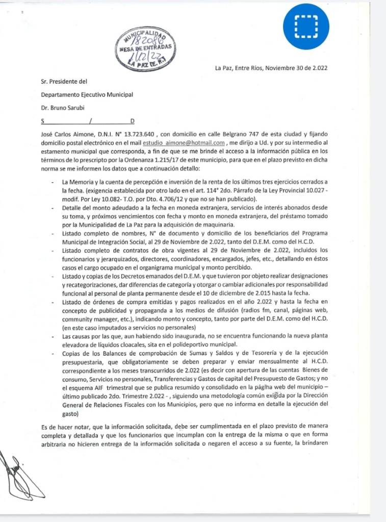 El ex intendente Aimone hizo un pedido de informes bajo la figura de «acceso a la información pública». Pretende conocer gastos, inversiones, deudas en pesos y en dólares, personal contratado y pagos a medios de comunicación y redes sociales, entre otros.