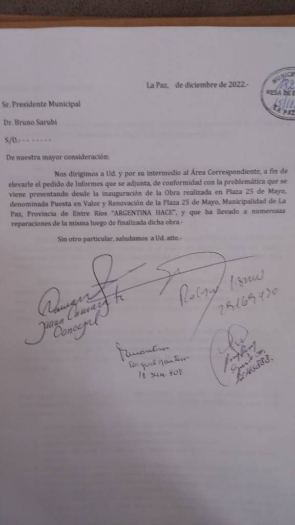 Preocupa a las y los concejales, la cantidad de reparaciones que se vienen haciendo en la «nueva» plaza y el alto costo de la obra pública pagada recientemente por el Estado Provincial y administrada por el Municipio paceño.