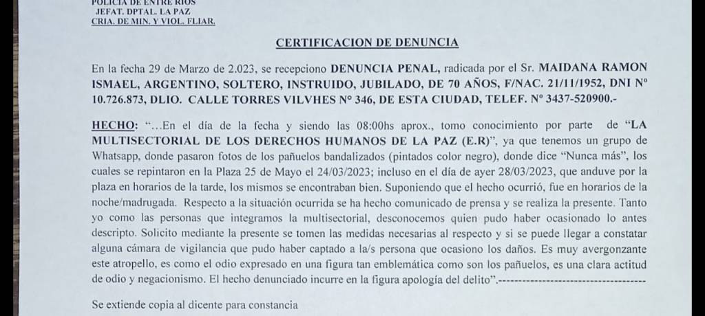 Se puede leer en la petición en línea de la Multisectorial de DD. HH. de la ciudad de La Paz: «Repudiamos de forma enérgica la vandalización de los pañuelos blancos pintados en la plaza 25 de mayo, el día 24 de marzo en conmemoración del día de la Memoria por Verdad y Justicia, borrando de los pañuelos la consigna NUNCA MÁS en un claro mensaje de que en La Paz existen personas que siguen pensando en que esa etapa oscura de nuestra historia se tendría que repetir, reivindicando a la dictadura genocida.»