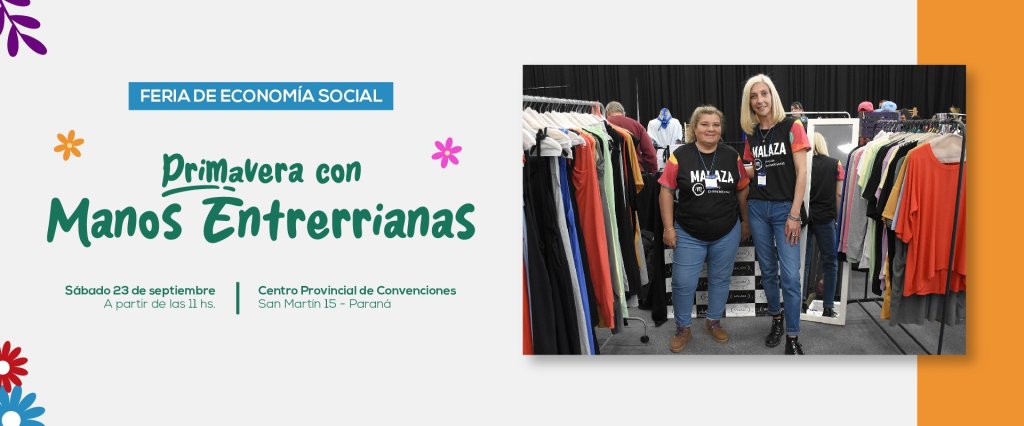 El 23 de septiembre, desde las 11 y hasta la medianoche, se llevará a cabo la Feria de Economía Social, primavera con Manos Entrerrianas, en el Centro Provincial de Convenciones — CPC — de Paraná. Indica la gacetilla oficial que «más de 100 feriantes ofrecerán sus productos. Habrá patio gastronómico, juegos y shows en vivo».