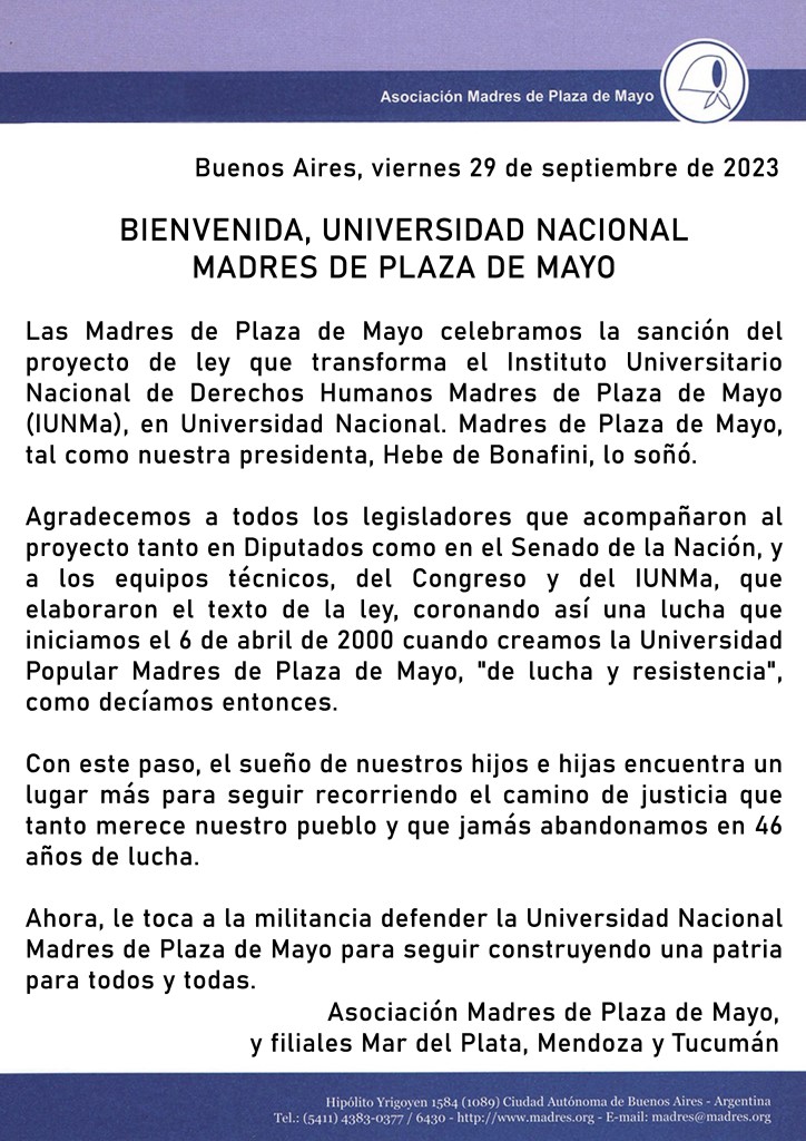 Primero fue Universidad Popular. Desde 2014, Instituto Universitario Nacional de Derechos Humanos Madres de Plaza de Mayo — IUNMA.