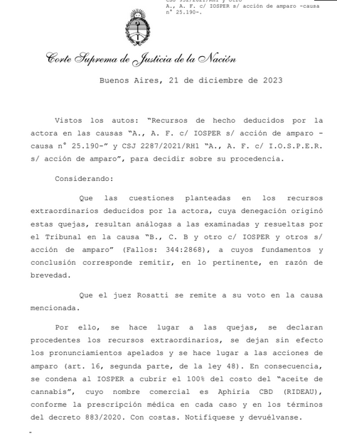 Indica la Agencia APF que la Corte Suprema de Justicia condenó al IOSPER a cubrir el 100% del costo del “aceite de cannabis”, cuyo nombre comercial es Aphiria CBD — RIDEAU — conforme la prescripción médica en cada caso y en los términos del decreto 883/2020.