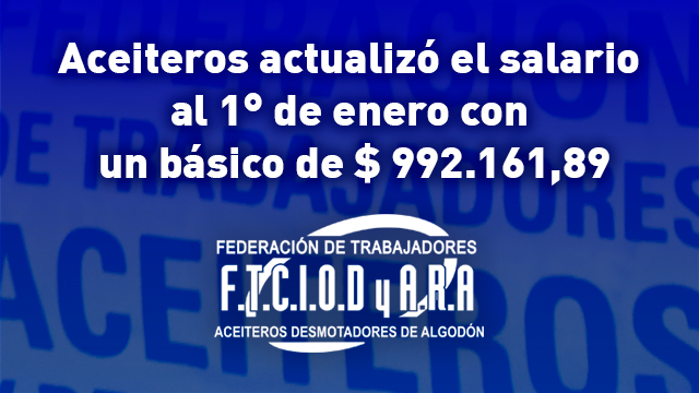 Indican en un parte de prensa: «Los compañeros paritarios de la Federación de Trabajadores del Complejo Industrial Oleaginoso, Desmotadores de Algodón y Afines de la República Argentina (FTCIODyARA) alcanzaron un acuerdo con los representantes patronales de las cámaras CIARA, CIAVEC y CARBIO que lleva el salario básico inicial a $ 992.161,89 -peón- a partir del 1° de Enero de 2024 para las y los compañeros obreros y empleados aceiteros que se encuentran en el Convenio Colectivo de Trabajo 420/05.»