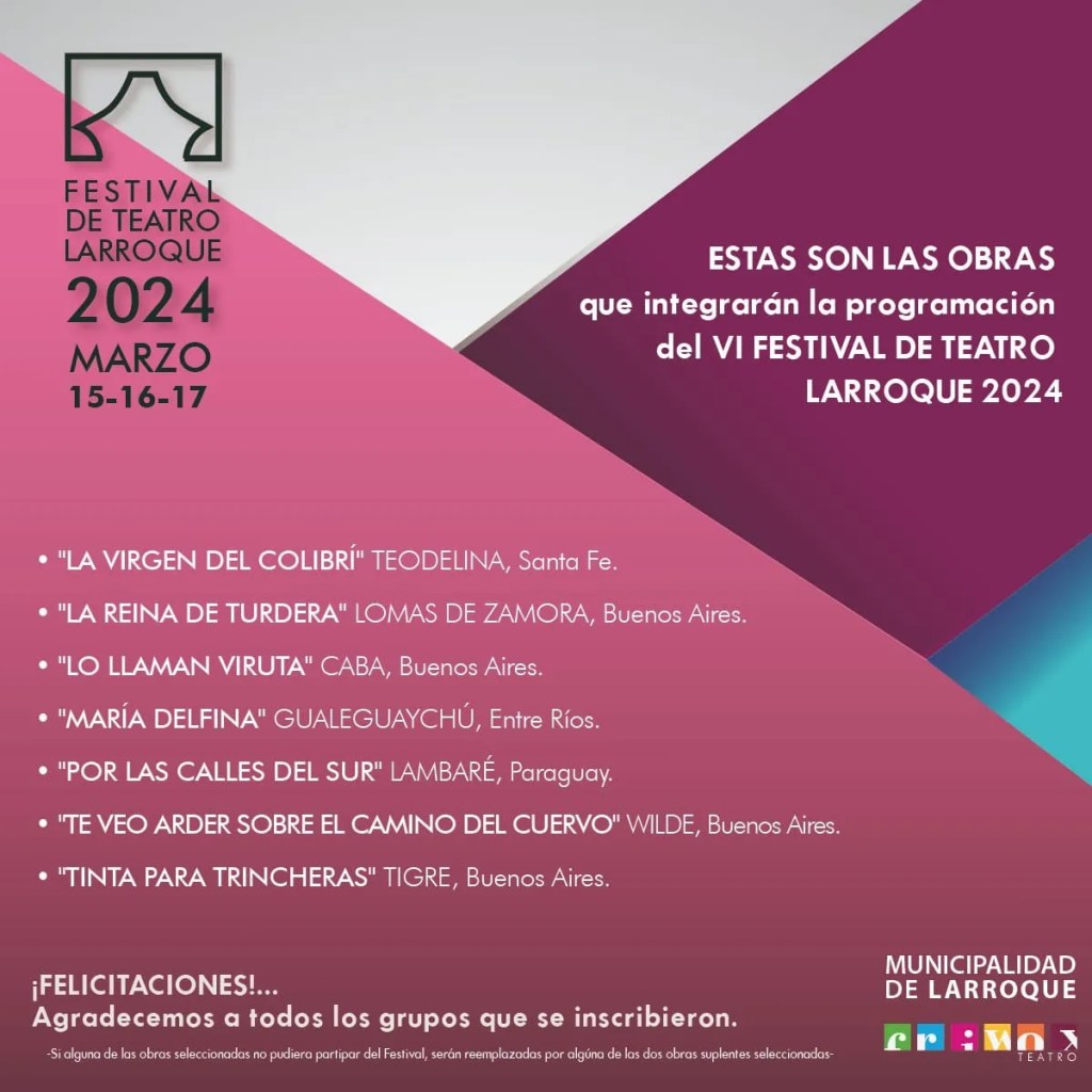 En sus redes sociales, Nazareno Molina posteó que «después de un arduo trabajo, pudimos definir las 14 obras que integrarán la programación del «VI Festival de teatro Larroque 2024».
