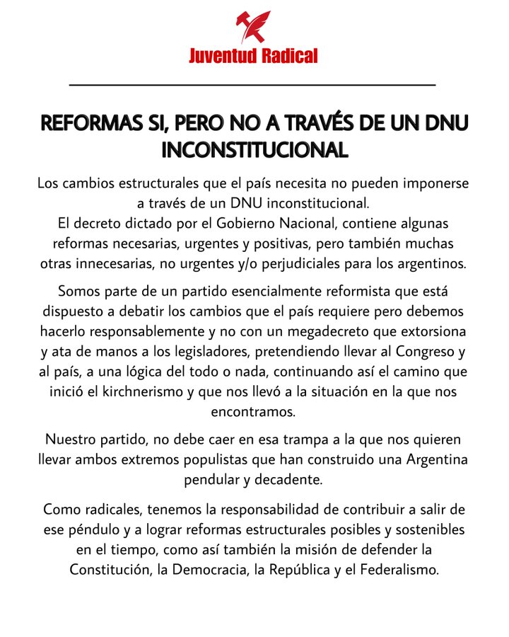 En línea con lo manifestado por Comité Nacional y la Convención Nacional de la UCR, las ramas de la Juventud también se manifiestan. Lo hizo días pasados la Federación Universitaria Argentina — FUA — y ahora la Juventud Radical — JR.