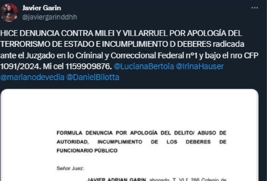 Indica el Diario Perfil que un abogado y docente de derechos humanos y ambientales denunció penalmente al presidente, Javier Milei; a la vice, Victoria Villarruel, y al ex titular de la central de inteligencia SIDE durante el menemismo Juan Bautista Yofre por presunta “apología del delito” por sus posturas sobre el golpe de Estado de 1976 y la represión durante la dictadura.