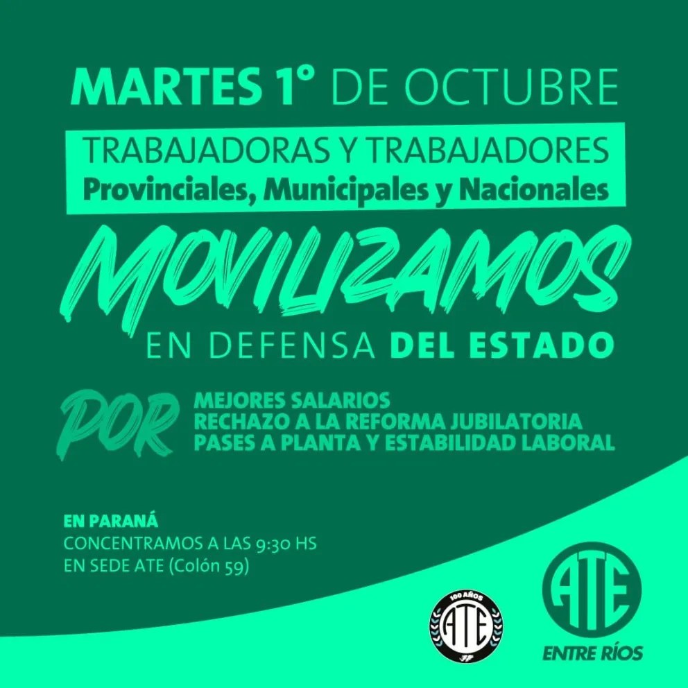 Luego del plenario del Consejo Directivo Provincial, el sindicato ATE Entre Ríos determinó paro y movilización desde las 9.30 horas, con concentración en la sede, para este martes por no haberse convocado a la paritaria en tiempo y forma. “Como consecuencia lo liquidado para fin de mes no cubre la inflación y no se incluyó el recupero de lo perdido desde diciembre del año pasado, entre otro puntos reiterados en la mesa hoy”, indicaron desde el gremio.
