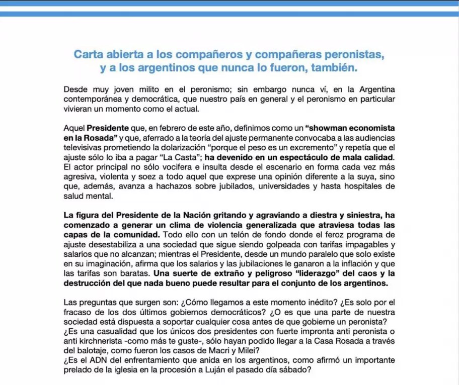 Y advirtió que «la unidad necesita dirección y proyecto para construir el mejor peronismo posible en una Argentina que se ha vuelto imposible para la mayoría de sus habitantes».