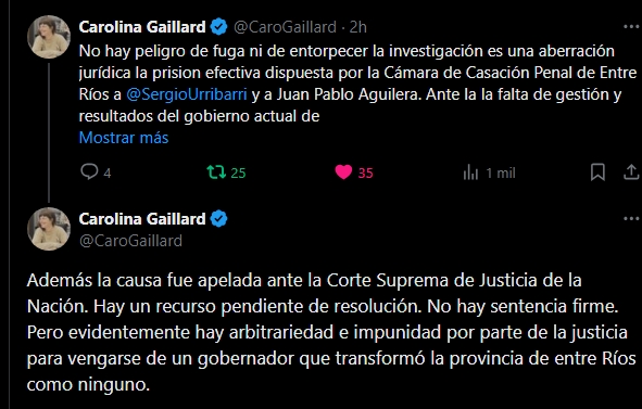 «No hay peligro de fuga ni de entorpecer la investigación es una aberración jurídica la prision efectiva dispuesta por la Cámara de Casación Penal de Entre Ríos a Sergio Urribarri y a Juan Pablo Aguilera. Ante la la falta de gestión y resultados del gobierno actual de Rogelio Frigerio y Javier Milei donde hay cada vez más pobres necesitan un circo para distraer con noticias cómo está. El derecho y la justicia no importa. Una vergüenza.