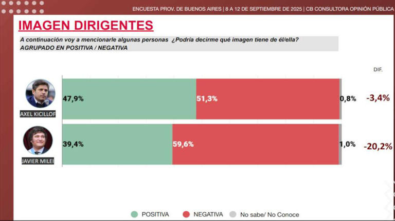 De acuerdo al resultado global de la provincia, Kicillof tiene un 47.9% de imagen positiva y un 51.3% de imagen negativa. En tanto, Milei tiene un 39.4% de positiva y un 59.6% de negativa. Estos números varían de acuerdo a la sección electoral, en el caso del gobernador bonaerense, tiene mejor imagen en la 1ra (+46,5%) y 3ra sección (+57,3%) pero disminuye en el resto de las secciones (+39,1%). Con el presidente sucede lo contrario, su imagen positiva es menor en la 1ra (+35,8%) y 3ra sección (+33,7%) pero aumenta en el resto (+49,8%).