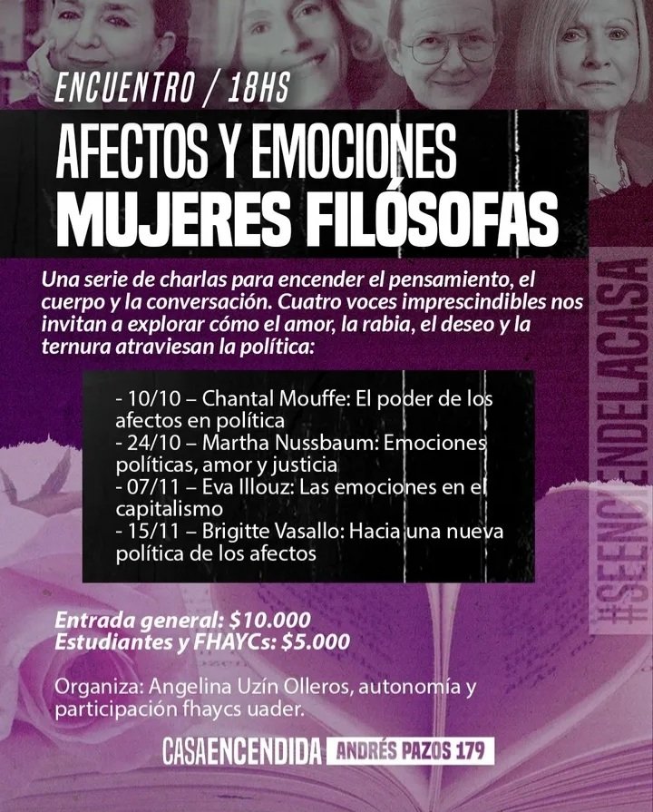 «Afectos, filosofía y emociones». Durante octubre y noviembre se recorren las perspectivas de cuatro filósofas acerca de los vínculos y lo que es sentir: Chantal Mouffe, Martha Nussbaum, Eva Illouz, y Brigitte Vasallo.